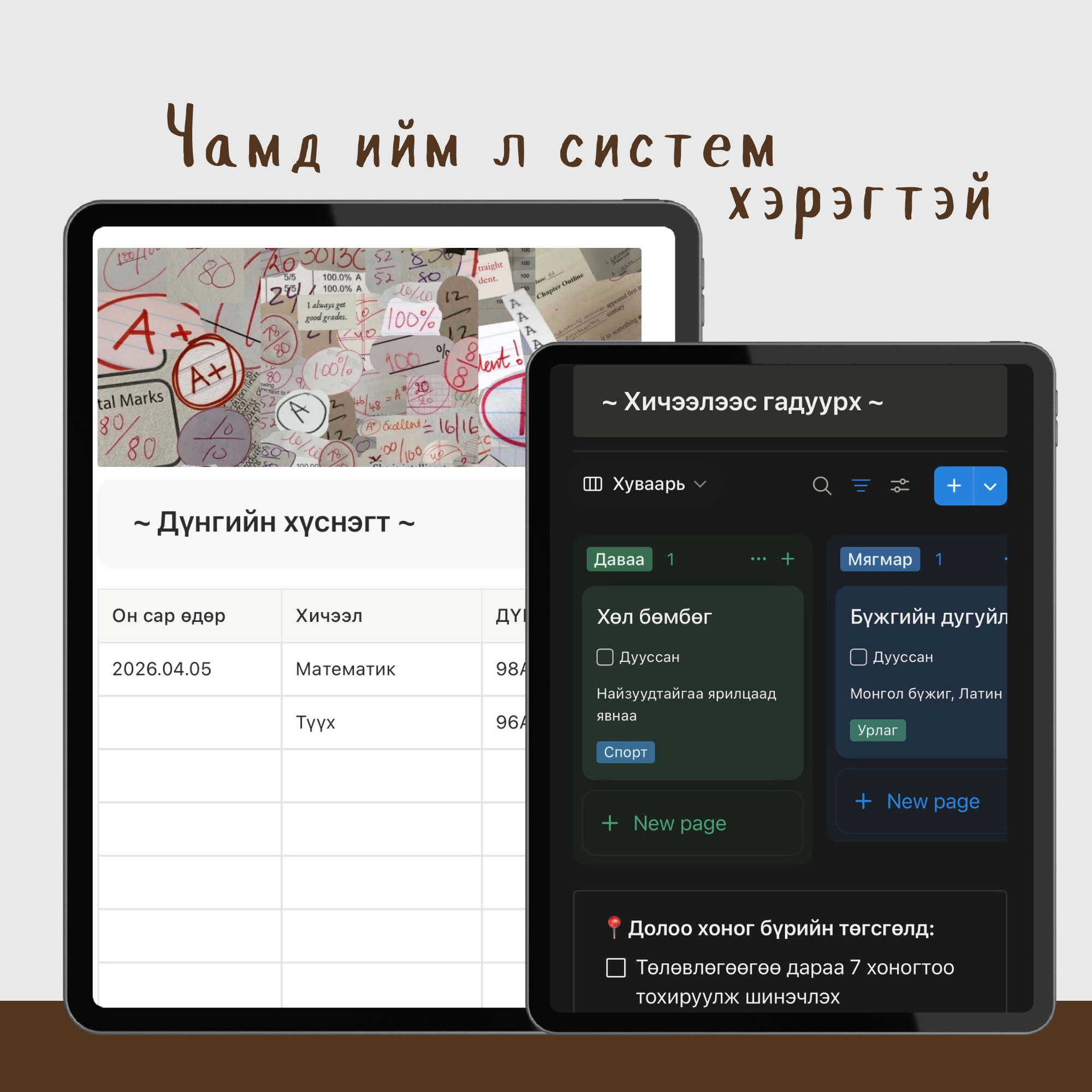 ✨Нэр, сургууль, ангиа оруулах хэсэг ✨Өөрийн зургийг оруулах ✨Өөрийнхөө тухай асуултад хариулж зорилгоо бичих хэсэг 🎓Хичээлийн хуваарь оруулах хянах хэсэг~автомат 🎓Гэрийн даалгавар тэмдэглэх хэсэг (автомат чеклэх) 🎓Автомат мэдэгдэл, дуусах хугацааг сануулах тохиргоо 🎓Хичээлийн багшаа тэмдэглэх 🎓Хичээлийн цагаа оруулах 🎓Энэ хичээлийн жилийн ЗОРИЛГОО бичих хэсэг 📈Дадал зуршлаа хянах- автоматаар цэвэрлэж дахин эхлэх тохиргоотой ⏳Помодоро цаг ✅Хичээлээс гадуурх дугуйлан секцийн хуваарь оруулах хянах хэсэг ✅Багш нарын холбоо барих мэдээлэл оруулах ✅Хичээл хийх сонирхолтой аргууд, подкастууд 📕Номын тэмдэглэл хөтлөх хэсэг (зохиолч тэмдэглэх, уншсан хуудсаа тэмдэглэх, явцаа хувиар харж хянах, төрлөөр ангилах, уншсан номоо үнэлэх сэтгэгдэл бичих хэсгүүдтэй) 📈Шалгалт дүнгээ оруулах хэсэг