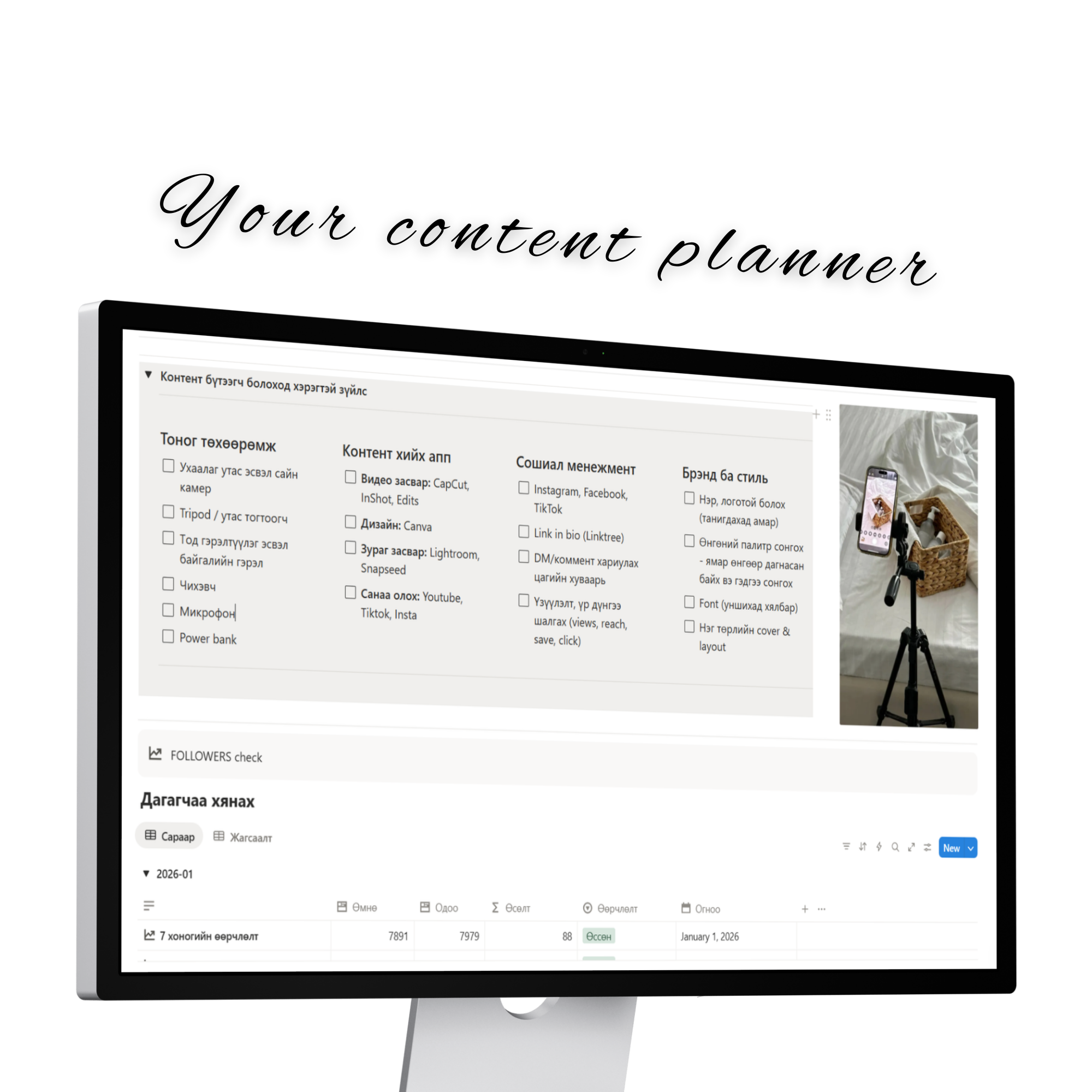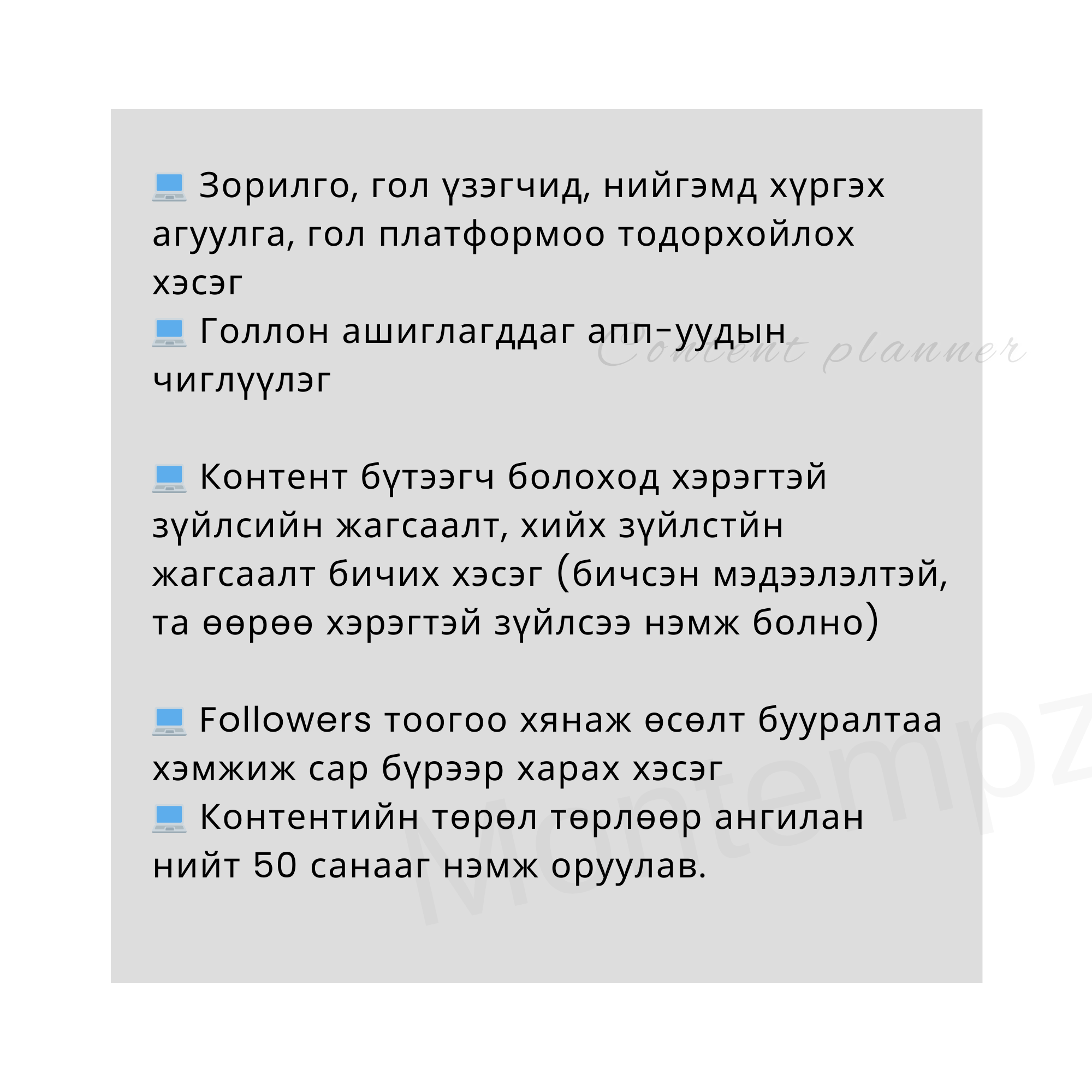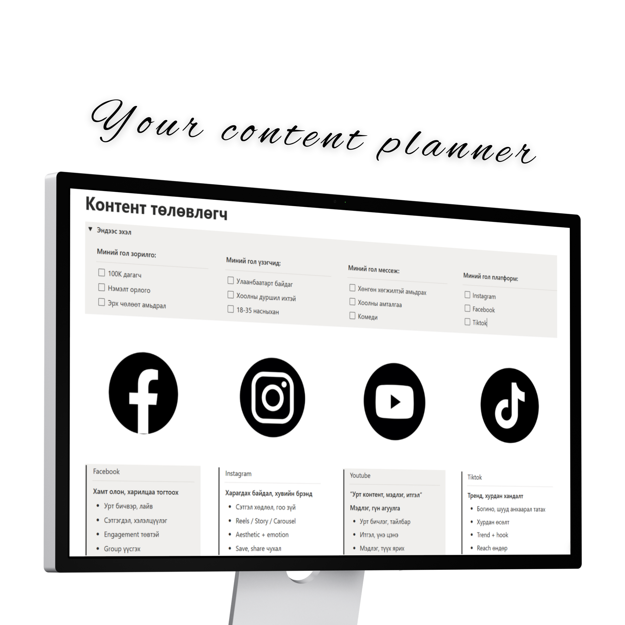 💻 Зорилго, гол үзэгчид, нийгэмд хүргэх агуулга, гол платформоо тодорхойлох хэсэг 💻 Голлон ашиглагддаг апп-уудын чиглүүлэг 💻 Контент бүтээгч болоход хэрэгтэй зүйлсийн жагсаалт, хийх зүйлстйн жагсаалт бичих хэсэг (бичсэн мэдээлэлтэй, та өөрөө хэрэгтэй зүйлсээ нэмж болно) 💻 Followers тоогоо хянаж өсөлт бууралтаа хэмжиж сар бүрээр харах хэсэг 💻Контентийн төрөл төрлөөр ангилан нийт 50 санааг нэмж оруулав. 📌 Контент дэлгэрэнгүй төлөвлөлт хэсэг 🔺 Санаагаа олсон | Хийж эхэлсэн| Дууссан ангиллаар багцлан харах 🔺 Календар дээр төлөвлөгөөт контентоо хянах хэсэг 🔺 Цалинтай | Цалингүй ангиллаар ялгаж харах хэсэг 🔺 Facebook | Instagram | Tiktok | Youtube платформоор ангилах харах хэсэг 🔺 Сар бүрээр орлогоо хянах хэсэг (автоматаар нэмэгдэж нийт орлого харагдана) 🔺 Жилийн нийт орлогоо дүгнэх хэсэг