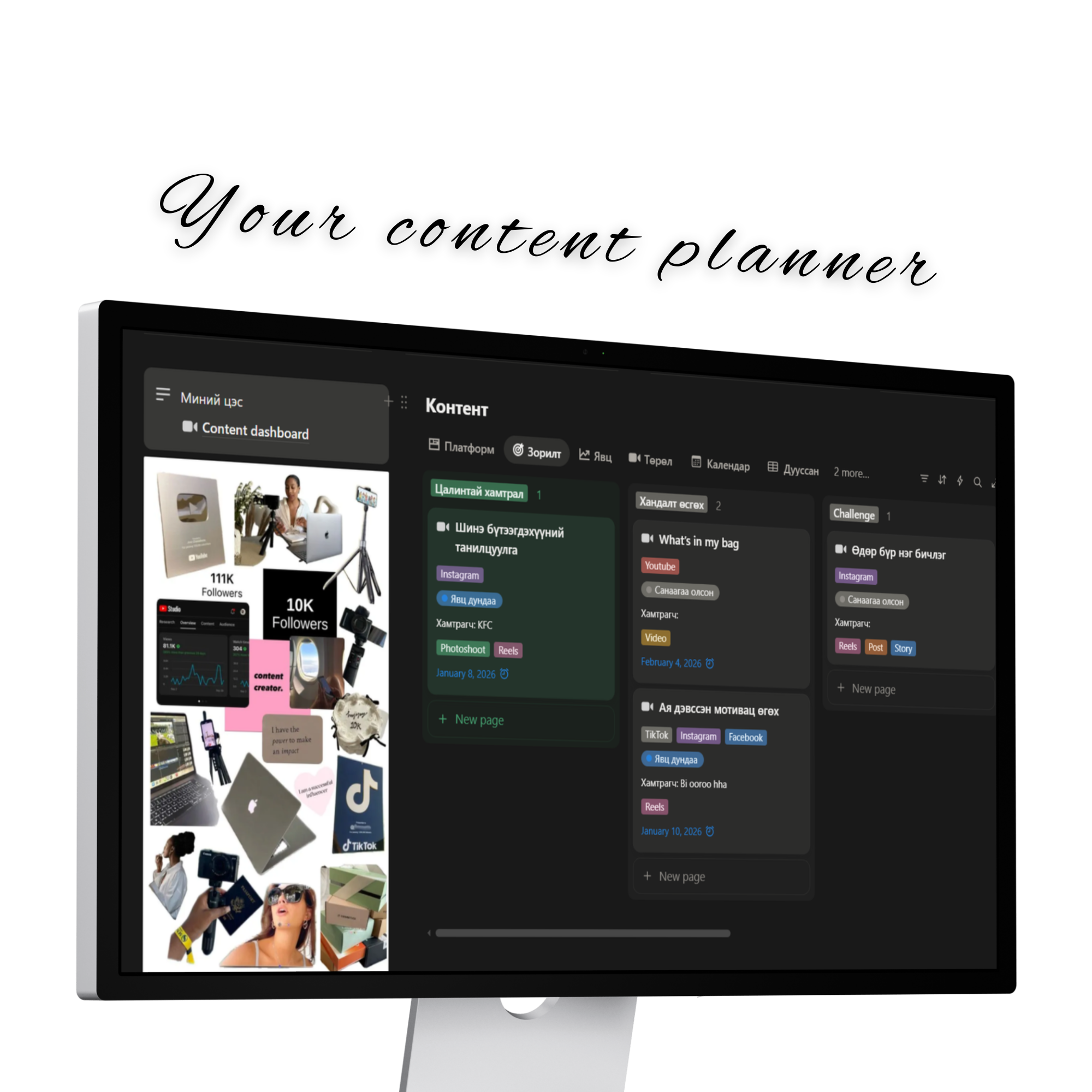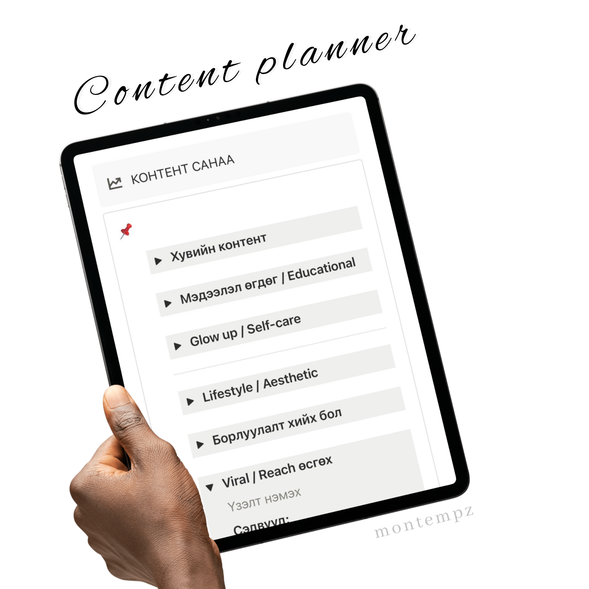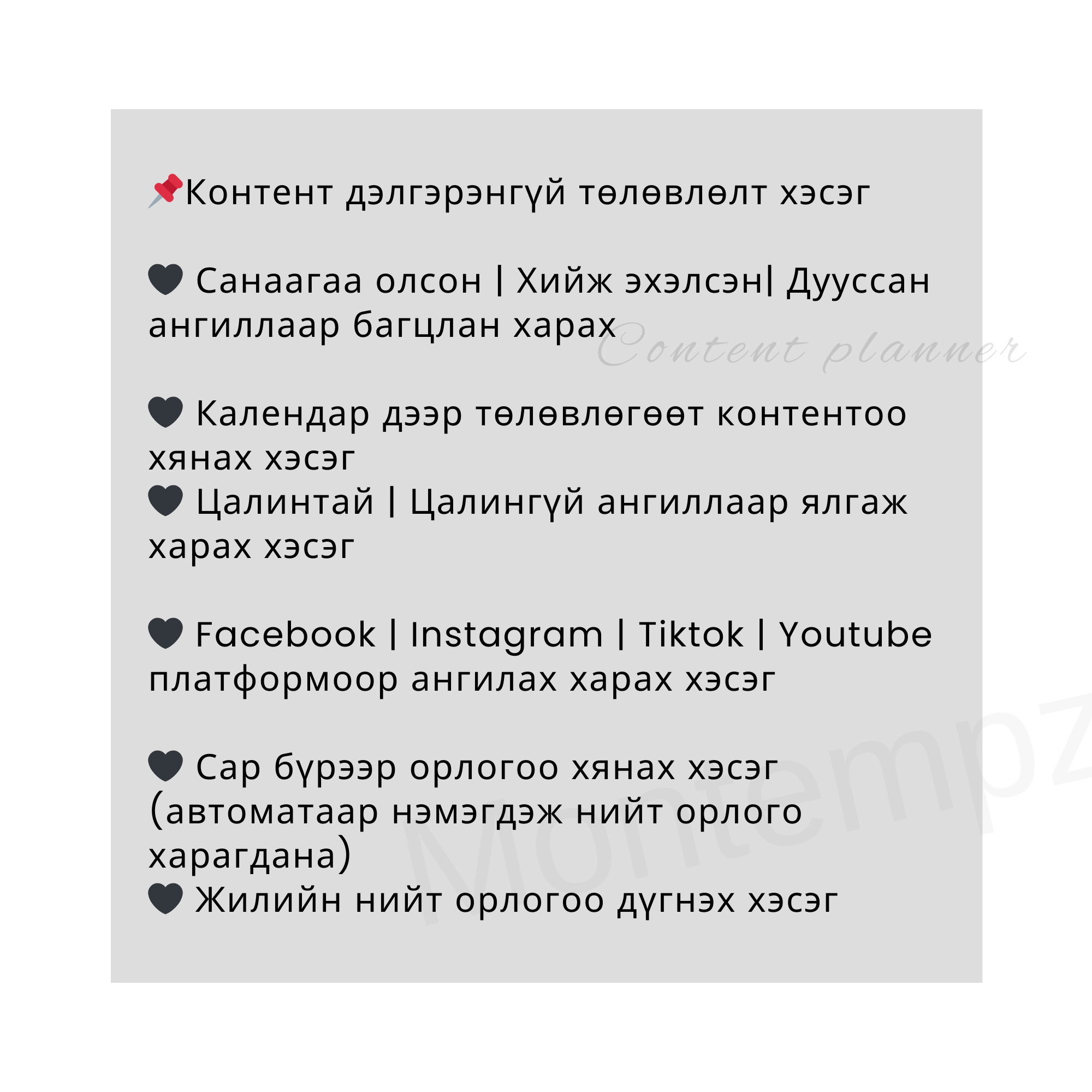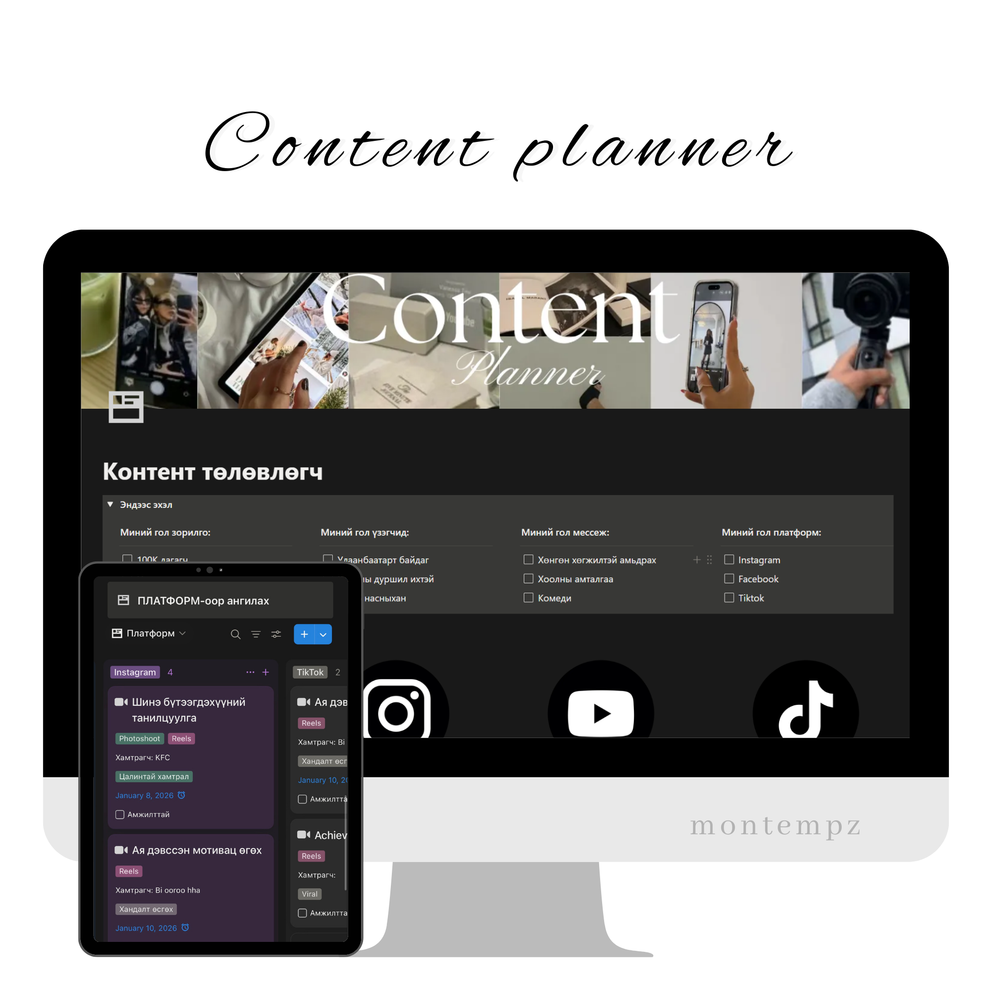 💻 Зорилго, гол үзэгчид, нийгэмд хүргэх агуулга, гол платформоо тодорхойлох хэсэг 💻 Голлон ашиглагддаг апп-уудын чиглүүлэг 💻 Контент бүтээгч болоход хэрэгтэй зүйлсийн жагсаалт, хийх зүйлстйн жагсаалт бичих хэсэг (бичсэн мэдээлэлтэй, та өөрөө хэрэгтэй зүйлсээ нэмж болно) 💻 Followers тоогоо хянаж өсөлт бууралтаа хэмжиж сар бүрээр харах хэсэг 💻Контентийн төрөл төрлөөр ангилан нийт 50 санааг нэмж оруулав. 📌 Контент дэлгэрэнгүй төлөвлөлт хэсэг 🔺 Санаагаа олсон | Хийж эхэлсэн| Дууссан ангиллаар багцлан харах 🔺 Календар дээр төлөвлөгөөт контентоо хянах хэсэг 🔺 Цалинтай | Цалингүй ангиллаар ялгаж харах хэсэг 🔺 Facebook | Instagram | Tiktok | Youtube платформоор ангилах харах хэсэг 🔺 Сар бүрээр орлогоо хянах хэсэг (автоматаар нэмэгдэж нийт орлого харагдана) 🔺 Жилийн нийт орлогоо дүгнэх хэсэг