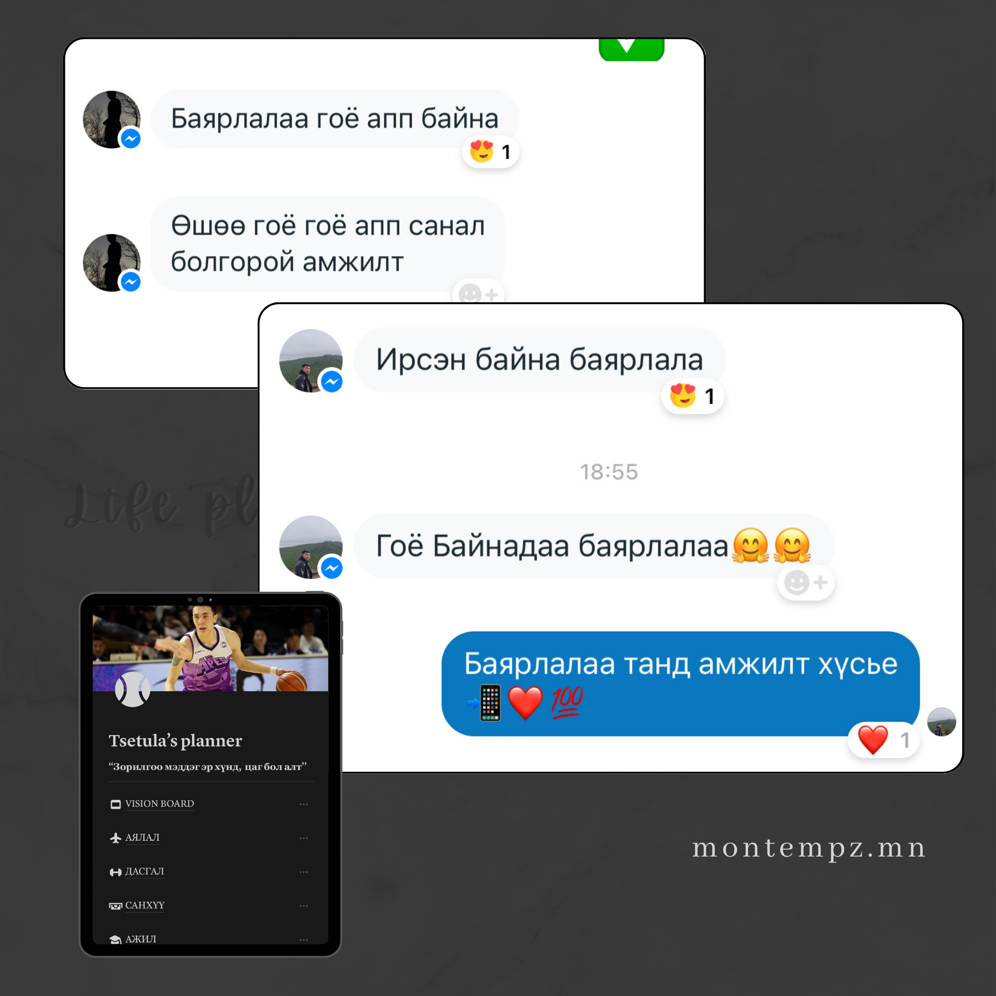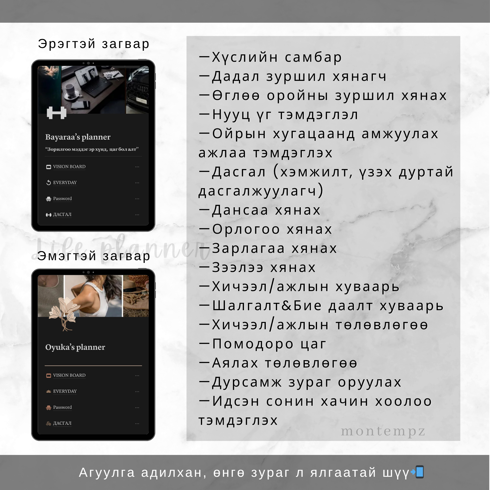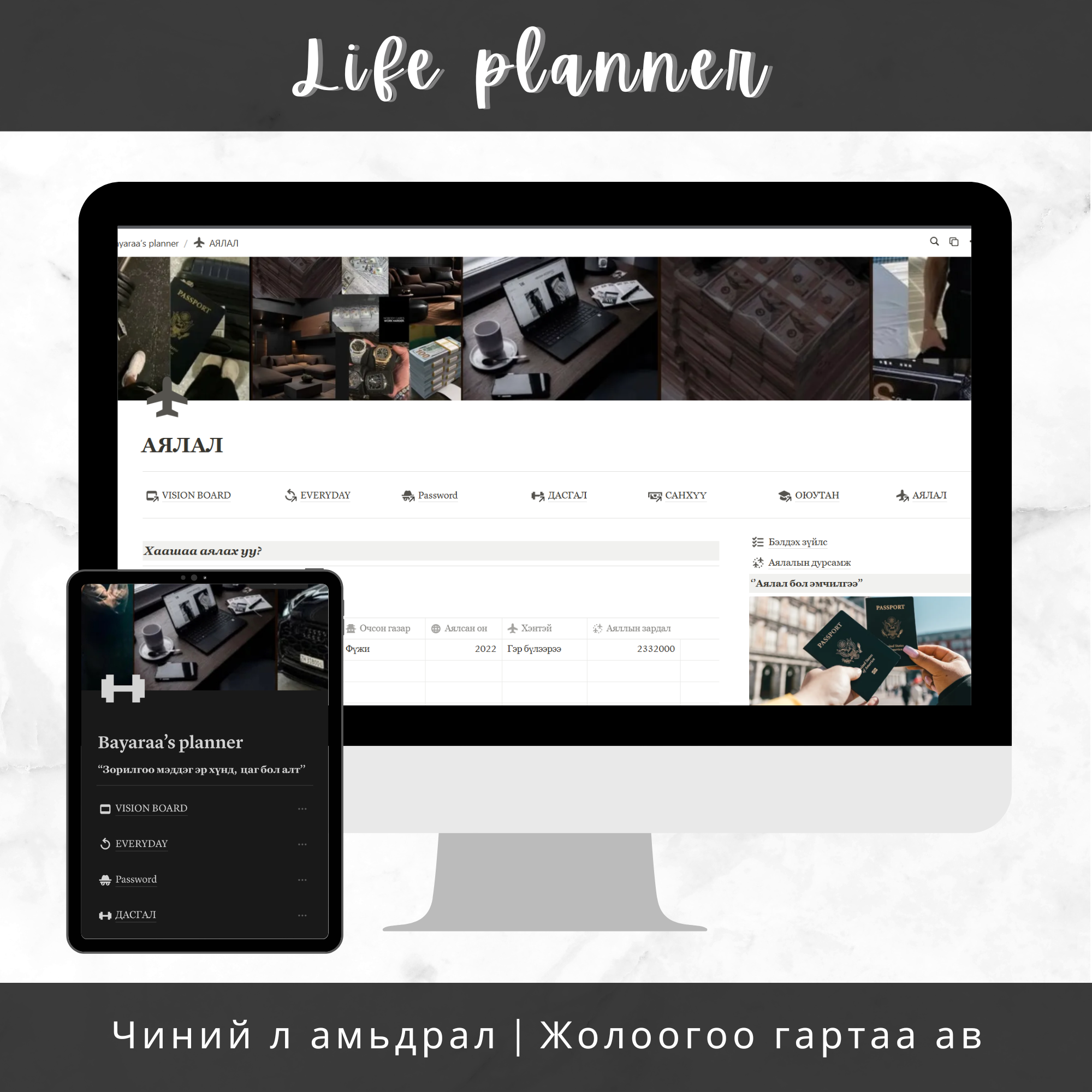 Life Planner нь хувь хүний хэрэгцээ, өдөр тутмын төлөвлөх шаардлагатай сэдвүүдэд тулгуурлан таны өмнөөс бүх хэрэгтэй бүтэц тохиргоог загварчлан бэлтгэсэн дижитал төлөвлөгч юм.