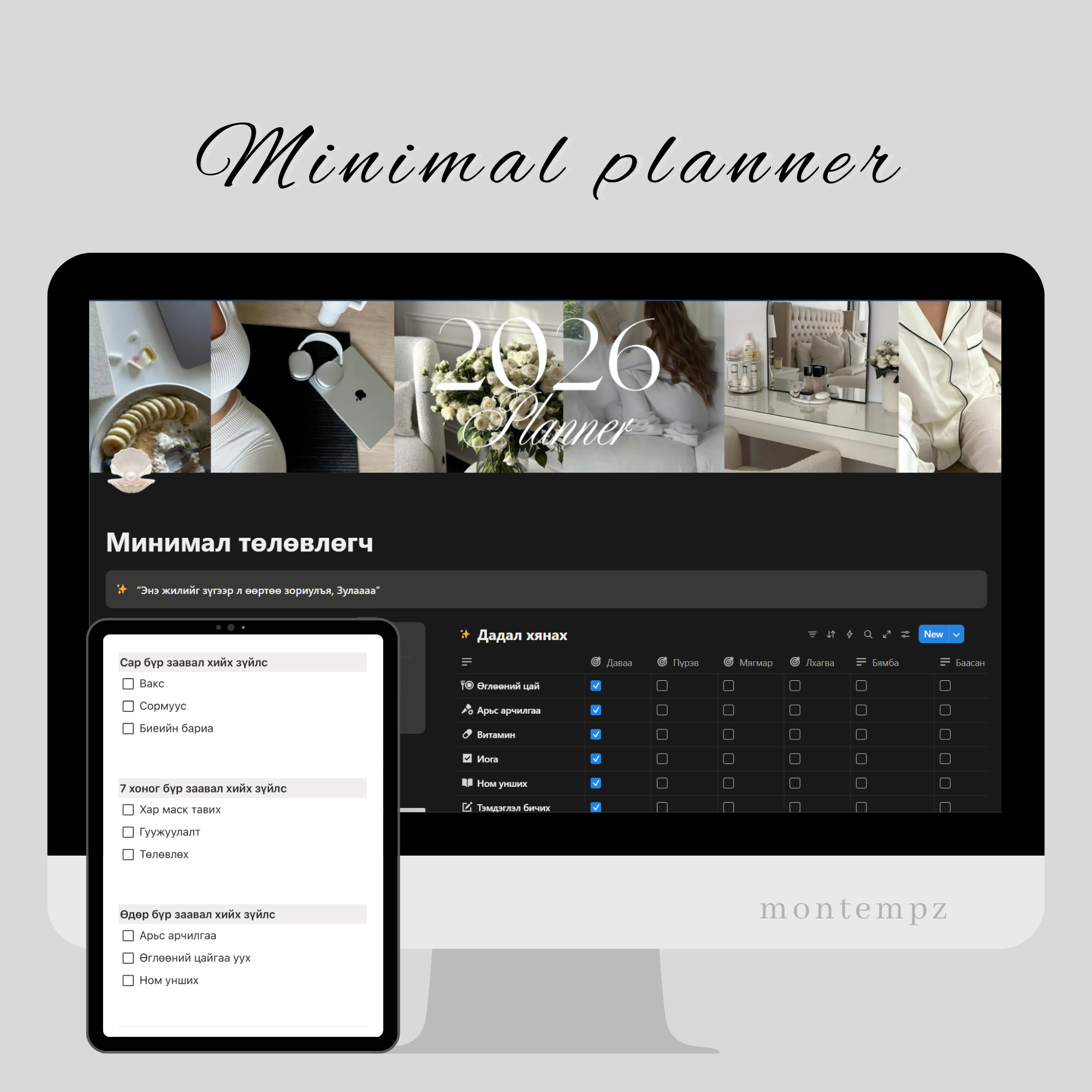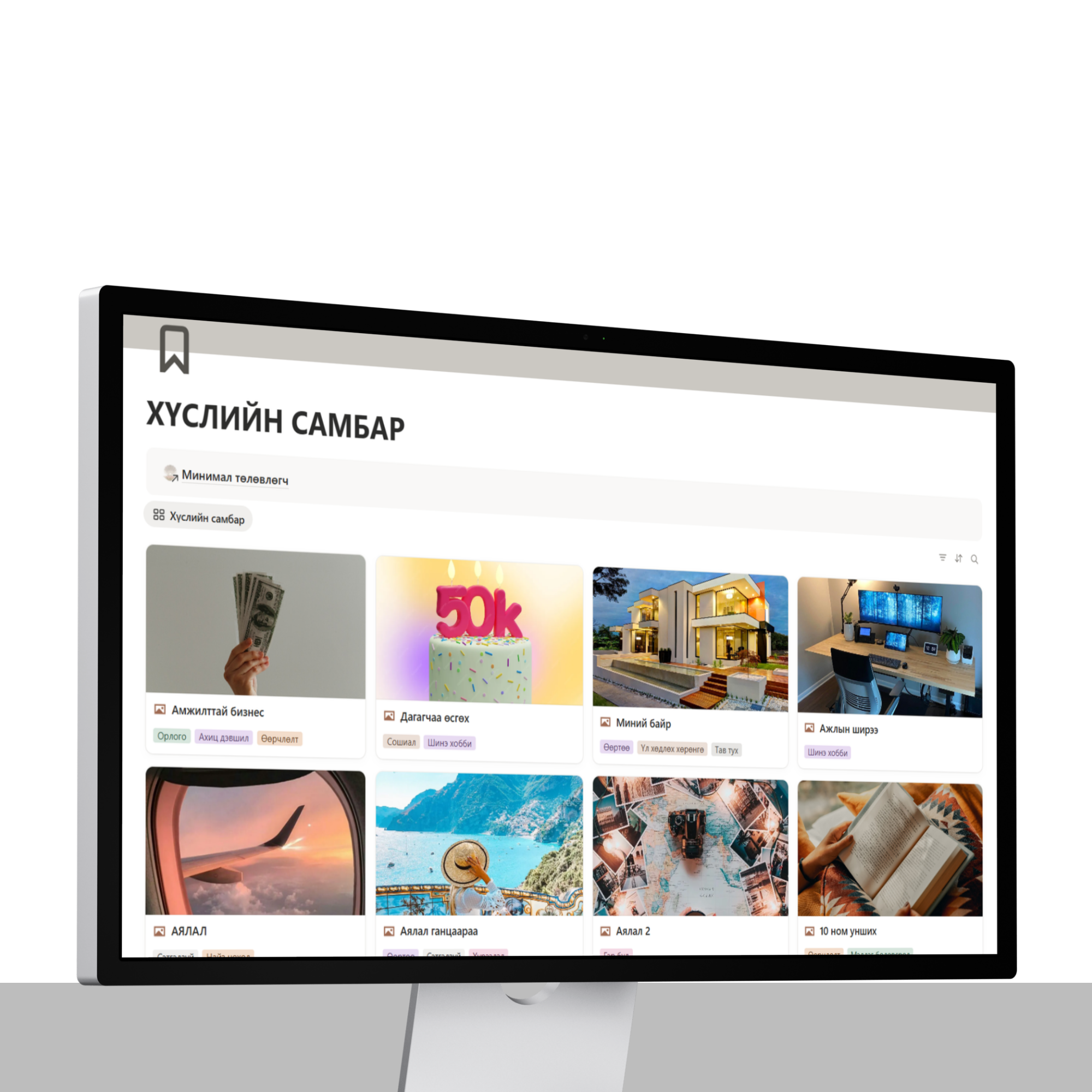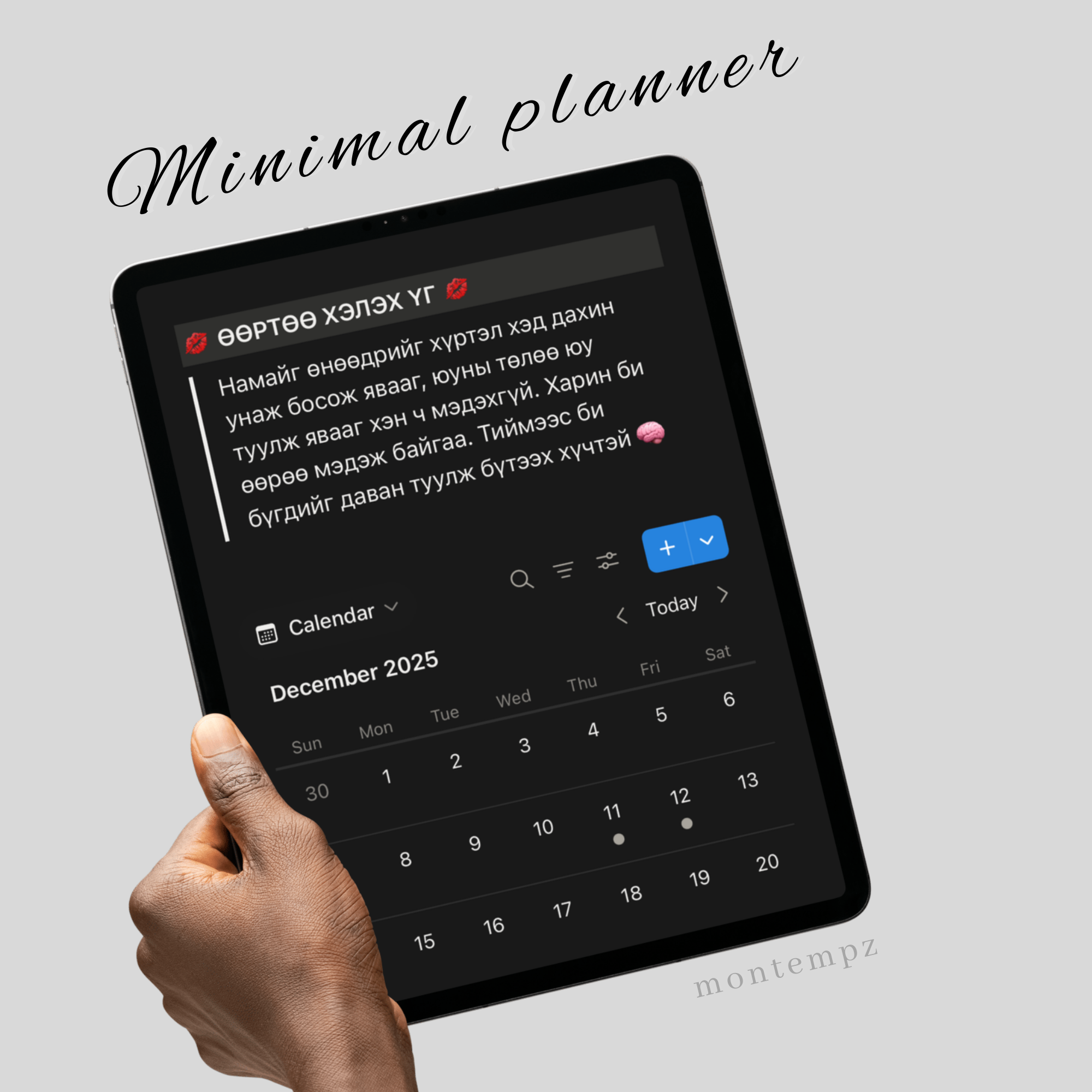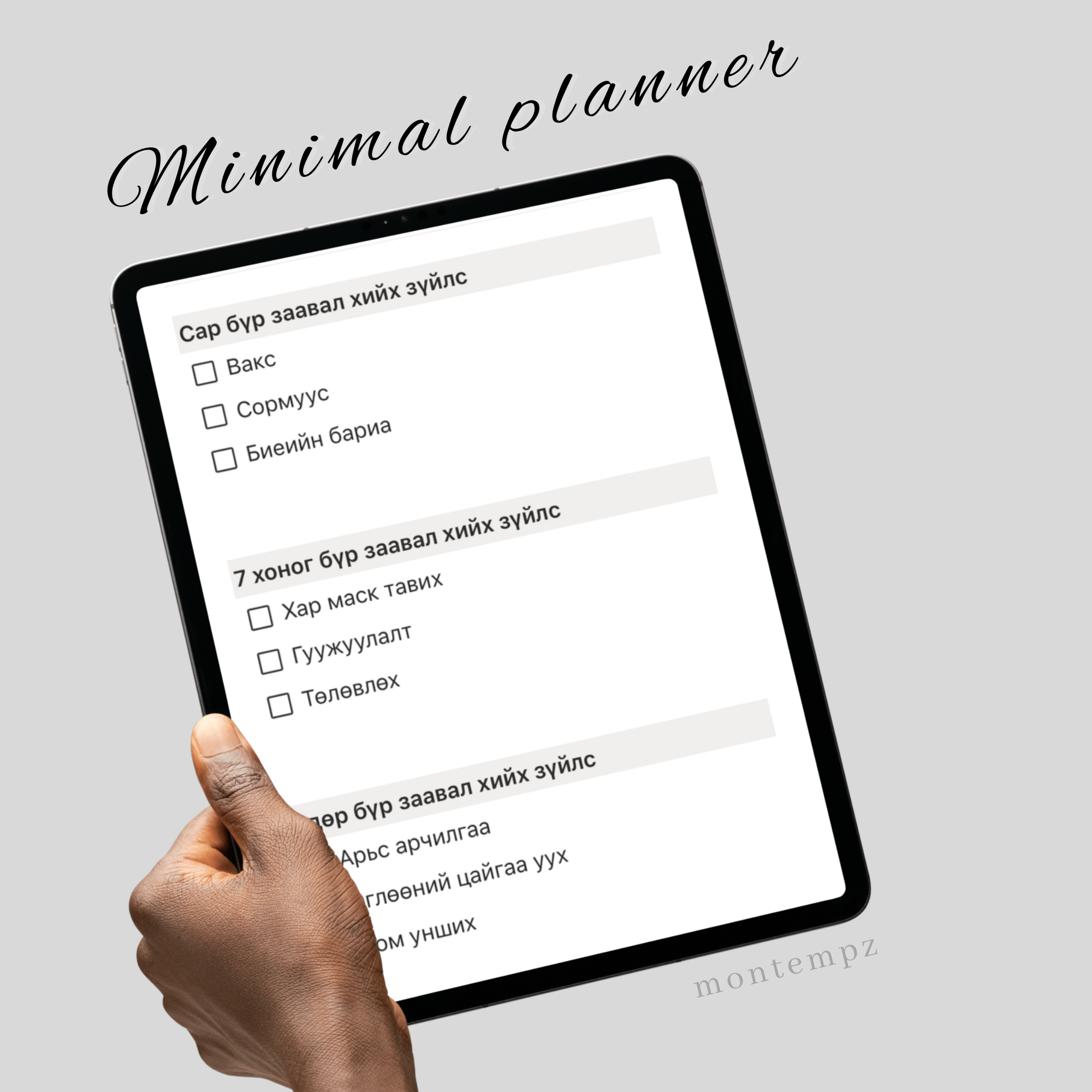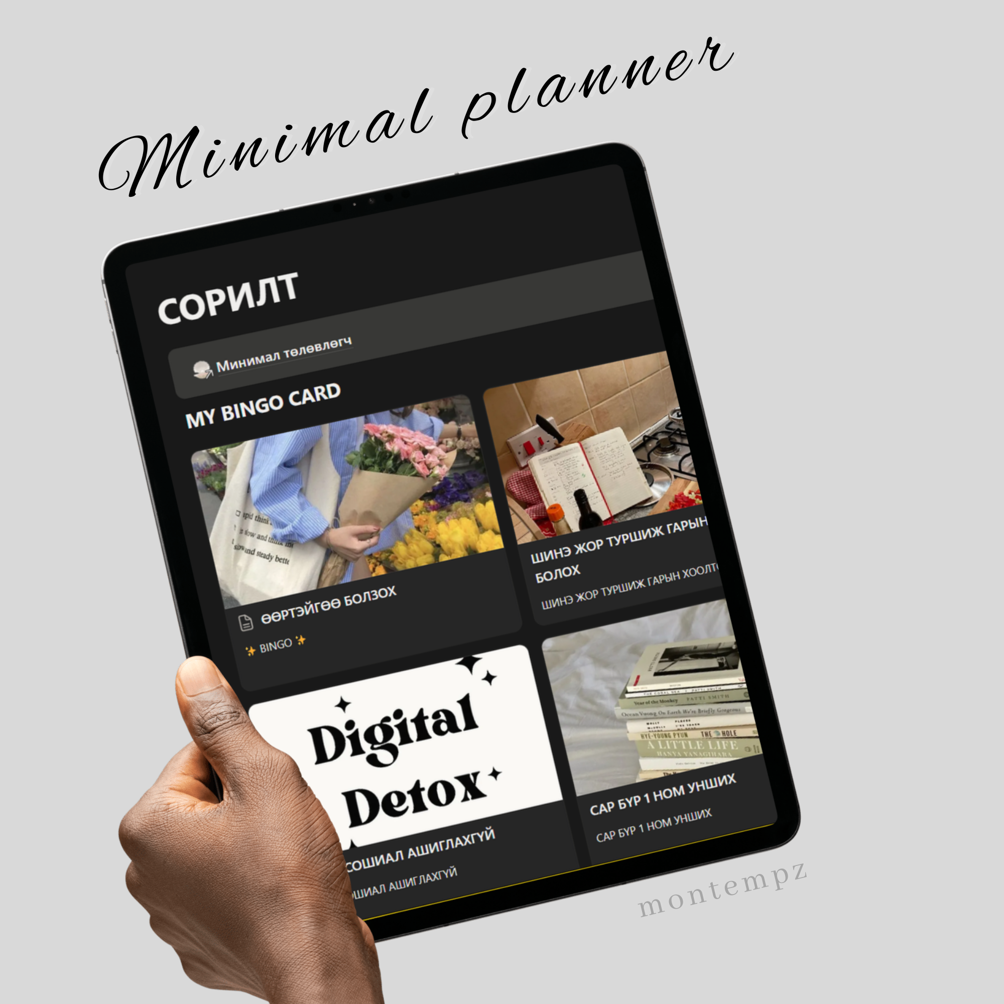 🩶Хүслийн самбар (төрлөөр ангилах, зураг оруулах) 🩶Сорилтууд оруулах самбар (хугацаа, тэмдэглэл, төлөвлөгөө гаргах) 🖋️Дадал зуршлаа хянах (7 хоног бүрээр бичих, чеклисттэй) 🖋️Календар (дээр нь уулзалт төлөвлөгөөгөө тодорхой оруулах, хаана хэзээ гэх мэт) 🖋️Сар бүр хийх зүйлсээ бичих хэсэг 🖋️7 хоног бүр хийх зүйлсээ бичих хэсэг 🖋️Өдөр бүр хийх зүйлсээ бичих хэсэг 🖋️Сар бүрийн тэмдэглэл хөтлөх (автомат товчтой) 🩶Жилийн эцсээ дүгнэх хэсэг